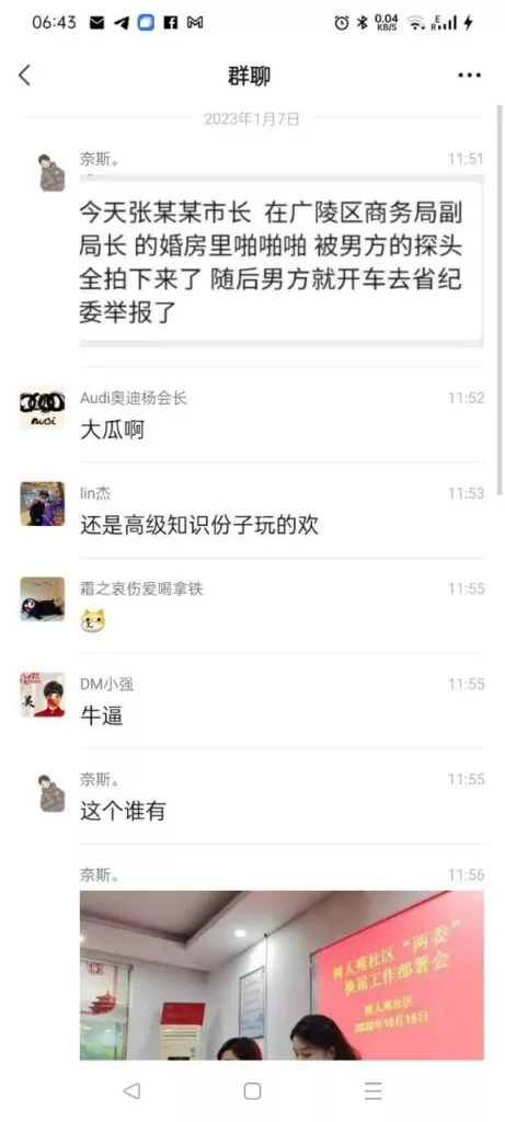 扬州市广陵区商务局副局长戴璐与市副市长张礼涛在戴璐的婚房内多次秘密私会,关系不清。戴璐的丈夫在家中安装了摄像头,意外拍下了他们的不当行为。愤怒之下,戴璐的丈夫将视频曝光到网络。
